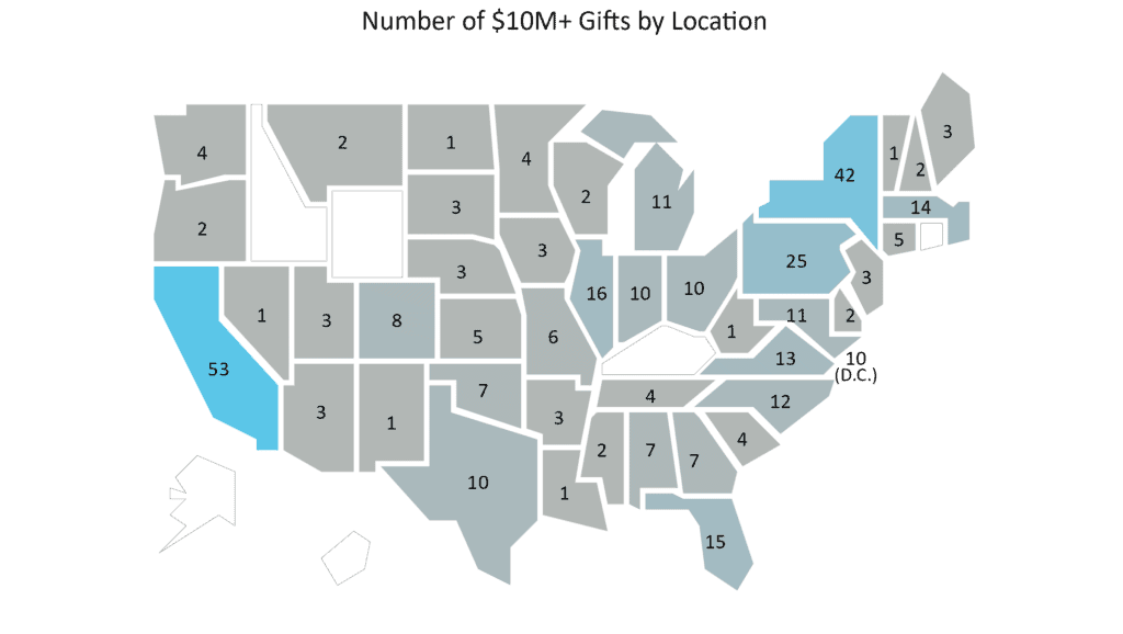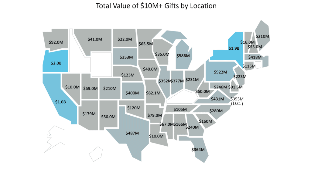 In a sign of the expanding scope of large-scale philanthropy, at least 10 gifts of $10 million+ were made to organizations in 13 states and Washington, D.C., the largest number recorded nationally over the past 10 years. Mega-gift giving exceeded $100 million for recipient organizations in 27 states and D.C., also a 10-year high.