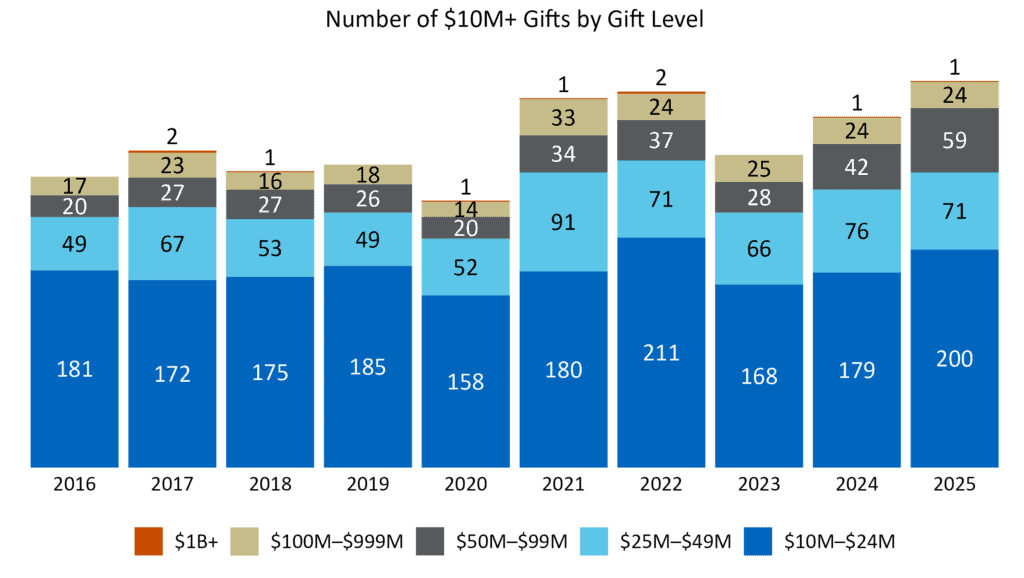 Charitable giving at the $10 million+ level strengthened significantly in 2025, building on 2024 gains and signaling a period of renewed expansion in philanthropy.