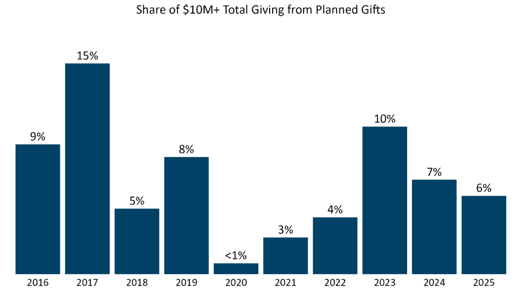 Planned gifts totaled $781.9 million in 2025, representing 6% of all $10 million+ giving. While total dollars were essentially flat year over year — up slightly from $780.4 million in 2024 — the number of mega-planned gifts increased markedly, rising from 22 in 2024 to 33 in 2025. Since 2016, planned gifts have contributed more than $8.3 billion in total, underscoring their sustained importance as an essential component of any long-term fundraising strategy.