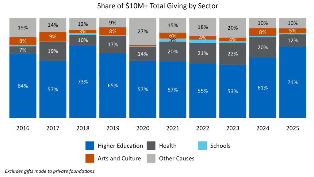 In 2025, the number of mega-gifts increased by 10%, the number of donors by 6%, and the total value by 21%. The year’s headline total was shaped in part by a single $2 billion gift—the largest recorded across all sectors—but growth was not driven by this outlier alone. Even after removing the top gift, the remaining $10 million+ contributions totaled $12.1 billion, exceeding comparable totals from both 2024 and 2023.