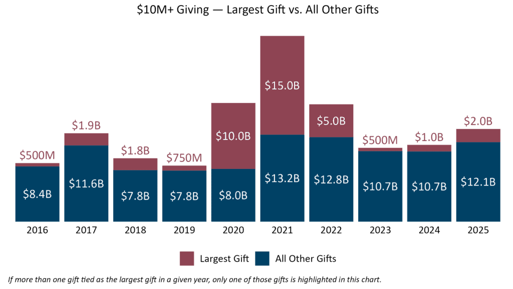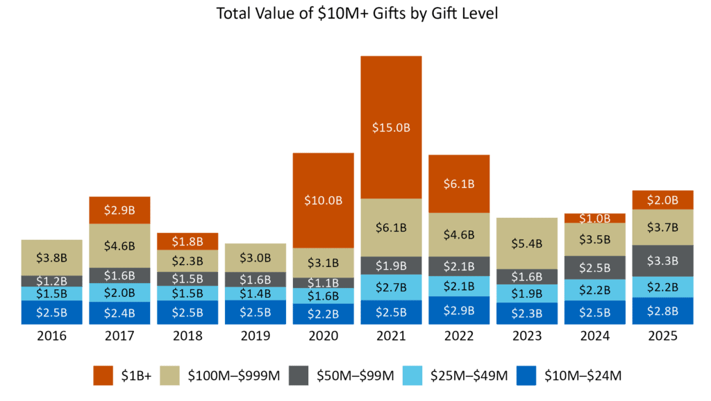 The $2 billion top gift was made to Oregon Health & Science University by Phil and Penny Knight. Beyond this contribution, MacKenzie Scott was the second-largest donor, making 43 separate $10 million+ gifts totaling more than $1.5 billion. Growth in 2025 was predominantly driven by eight- and low nine-figure giving.